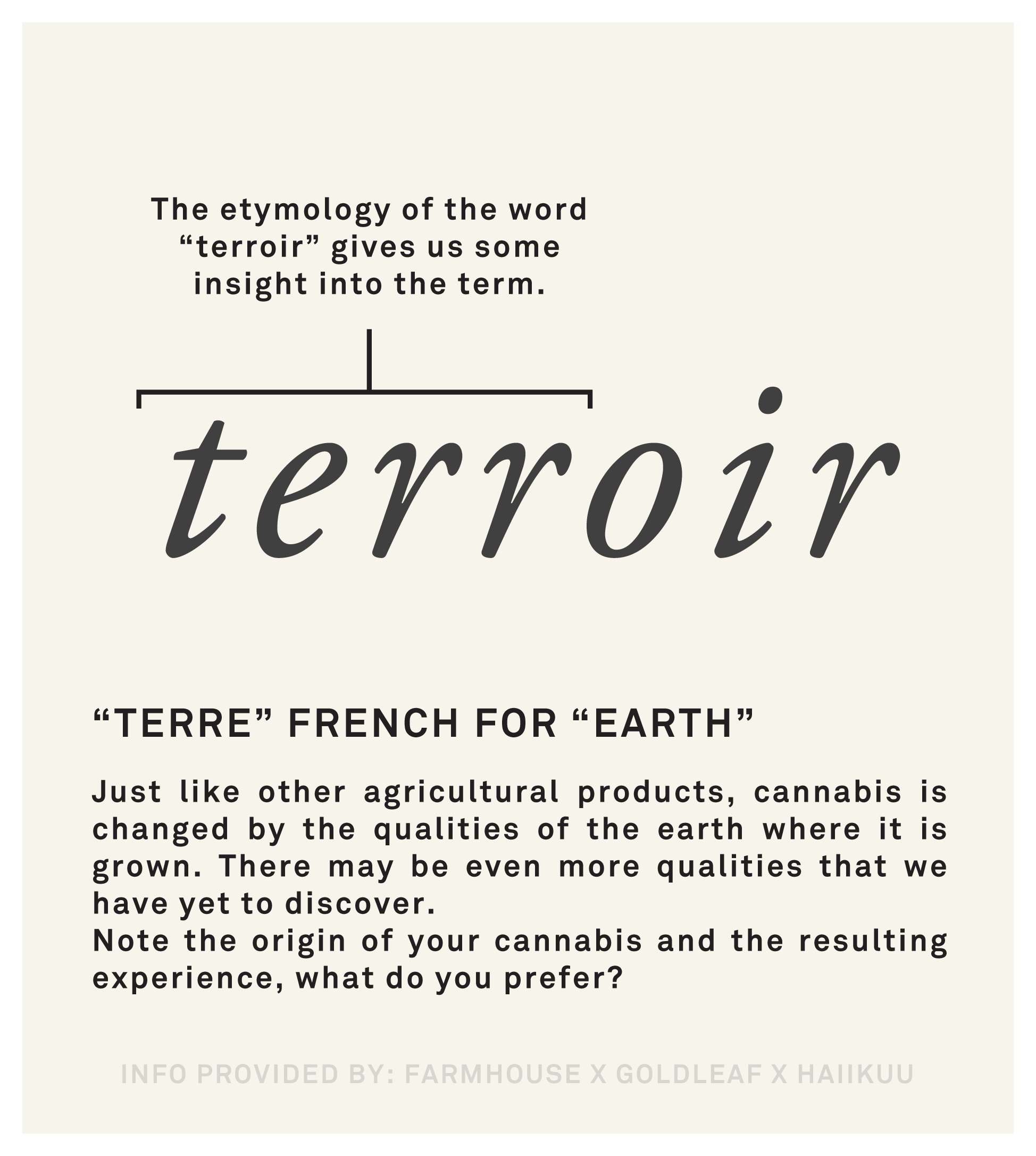 Terroir is used to describe the qualities of cannabis that are affected by the environment where it is grown. Terroir can affect terpene quality, flower size and elicit different phenotypes to be expressed in a strain.